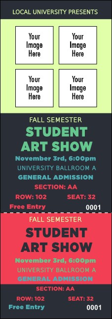 Choose a simple, effective design for your art show and sell the Image Upload Reserved Event Ticket in advance. Bright green, pink and blue text stands out on a charcoal grey background. Add four of your own pictures to the template to showcase artists. Add venue seat numbers to the tickets for added organization.